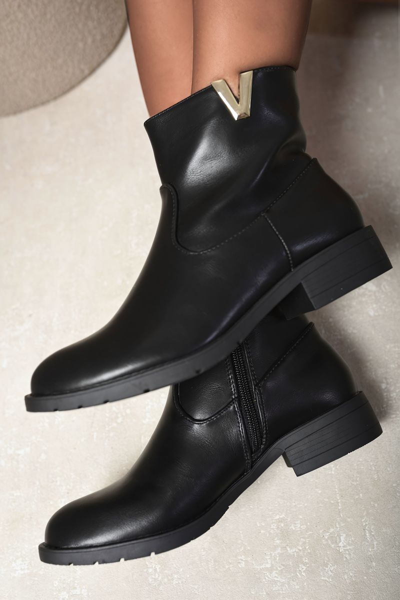 V-shaped Gold Ornament Zip Closure Flat Ankle Boots