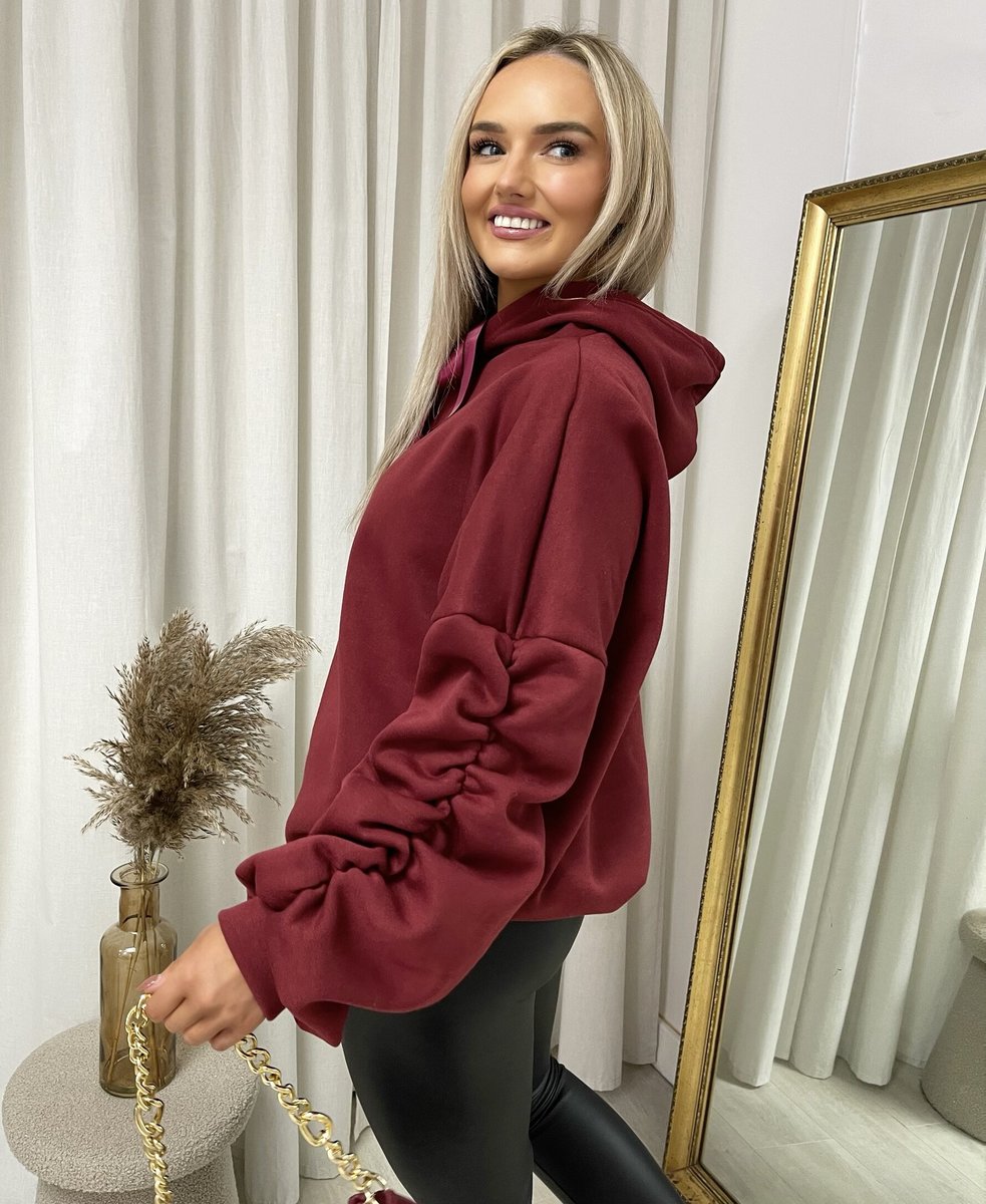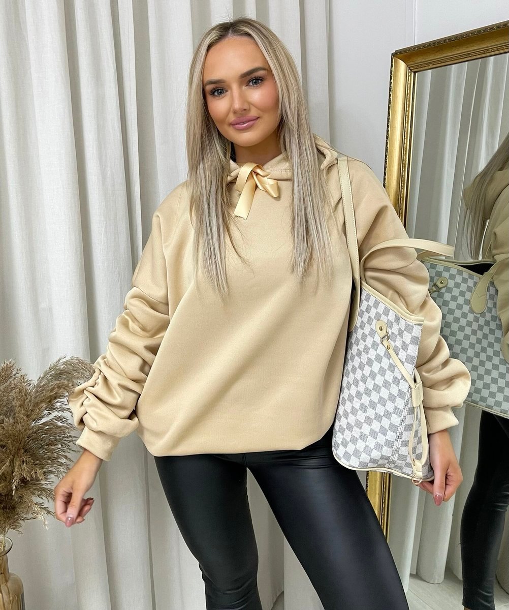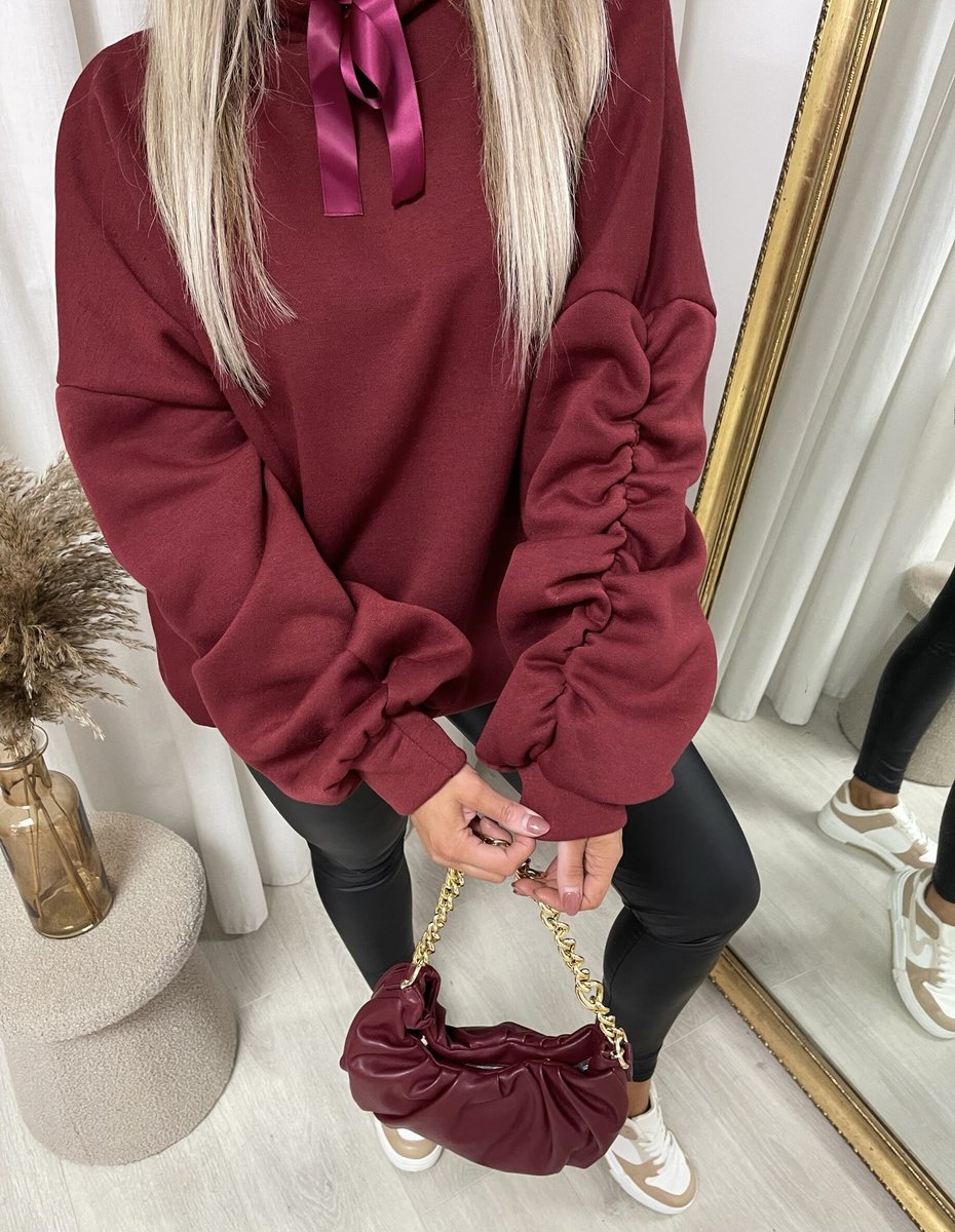 Oversized Ruched Sleeves Knitted Hoodie with Ribbon Detail